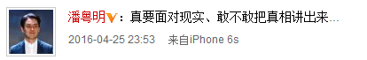 潘粵明何出此言?原來之前董潔在節(jié)目里曾回應過關于前夫的問題,當時工作人員直截了當?shù)貑査旐敃谀忝媲皢栮P于爸爸的問題嗎?董潔淡然地回答,命運是沒有辦法改變的,我們每個人呢都要接受現(xiàn)實。或許正是這句話激怒了潘粵明,讓他在微博上疑似要再度宣戰(zhàn)。