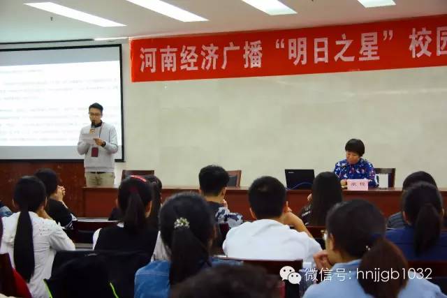 原來是河南經濟廣播“明日之星”校園主持人大賽賽前培訓現場呀!還沒到開講,房間里就已經座無虛席。