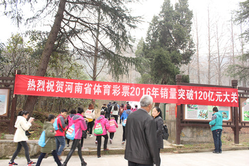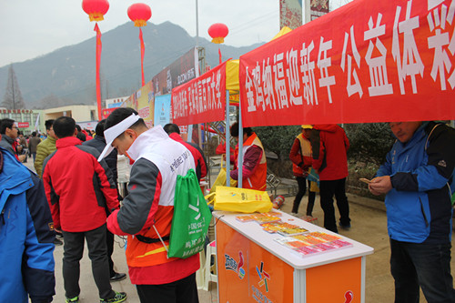 全民健身活動連年開展,并且已經形成全國聯動,區域互動,百姓自動的蓬勃景象,這離不開體彩彩民朋友點滴的愛心匯聚和體彩人不分晝夜的堅持拼搏,為了展示體育彩票的公益性和玩法樂趣,信陽分中心還在開幕式現場搭建了四張大型展板,“公益體彩 快樂操場”“送體育進鄉村”“體彩?新長城助貧困大學生項目”“貧困受災地區愛心捐贈”等等,散發出一縷縷公益光芒,溫暖著寒冬里登山人的心。 “河南體彩攜手京東購物送300萬大樂透代金券”“購買頂呱刮彩票 搶百萬紅包 贏華為手機活動”,特別吸引了年輕登山人群的圍觀和關注。信陽分中心開展戶外即開型銷售主推“金雞納福”新年套票,雞年登雞公山購買“金雞納福”頂呱刮彩票有著特殊的意義,購買滿30元還有登山“能量包”相送,為健身登高增添動力。