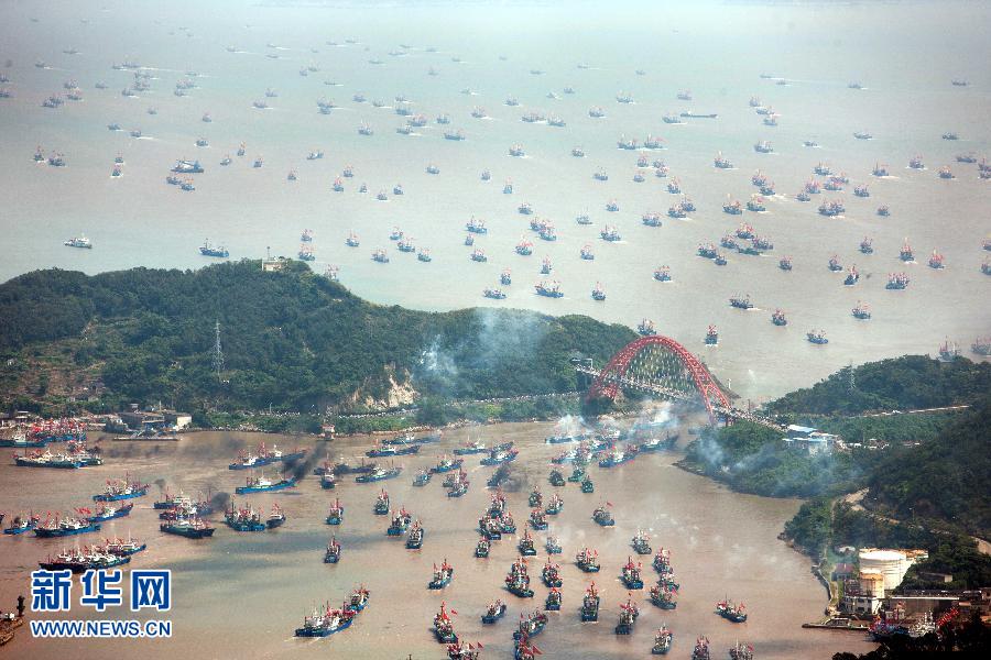 9月16日,浙江省舟山市沈家門漁港的漁船出港經過朱家尖大橋開赴漁場。當日,為期3個半月的東海伏季休漁結束,眾多漁船劈波斬浪,開往漁場。 新華社發(華志波 攝)