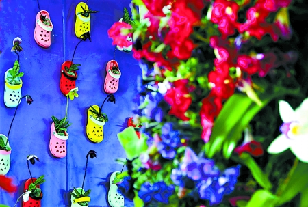 4月6日,“2012洛陽·中國名花展”在洛陽國家牡丹園開展,15天的展期將展出91類、200余種國內珍奇名貴花卉。圖為展出的“仙履芳蹤”插花造型。 新華社發