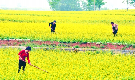 4月23日,嵩縣大坪鄉大坪村農民在大白菜制種基地進行田間管理。今年該村與濟源一家農業公司簽訂1000畝白菜制種合同,由公司提供種子和前期農資用品,采取“公司+農戶”種植模式制種,白菜種子從種植到收獲僅用2個月,每畝可收入2000多元。一村民說:“種一畝麥子需要8個月時間,對于我們這個干旱缺水的山區,每畝收入不足600元,訂單培育白菜種子,真是太劃算了!” 記者 楊遠高 攝