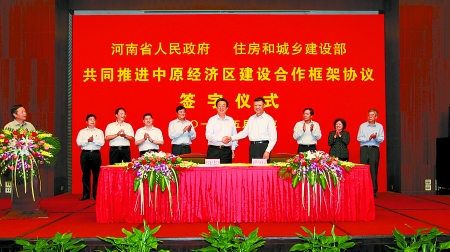 5月10日下午,河南省人民政府與住房和城鄉建設部在北京簽署《共同推進中原經濟區建設合作框架協議》,省委副書記、省長郭庚茂,住房和城鄉建設部部長姜偉新出席簽字儀式,并代表雙方簽署協議。