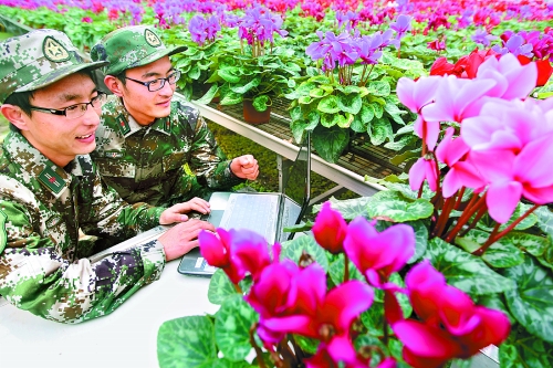 12月19日,鄢陵縣柏梁鎮民兵在網上銷售花卉。今年,該縣在民兵中開展了“一名民兵一個項目”活動,并成立了“民兵創業示范基地”,引導民兵選擇回報率高、銷路相對暢銷的花卉作為創業項目,帶動周邊農戶種花致富。牛書培 權國棟 攝