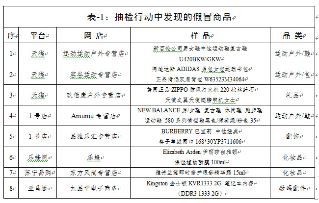 工商總局公布“雙11”期間對電商平臺促銷商品的抽檢結果:已確認8批次樣品為假冒商品,天貓3個,1號店2個,樂蜂網、蘇寧易購、亞馬遜各1個;7批次樣品涉嫌假冒商品正在分析中。另有7批次樣品質量不合格或標簽不合法。
