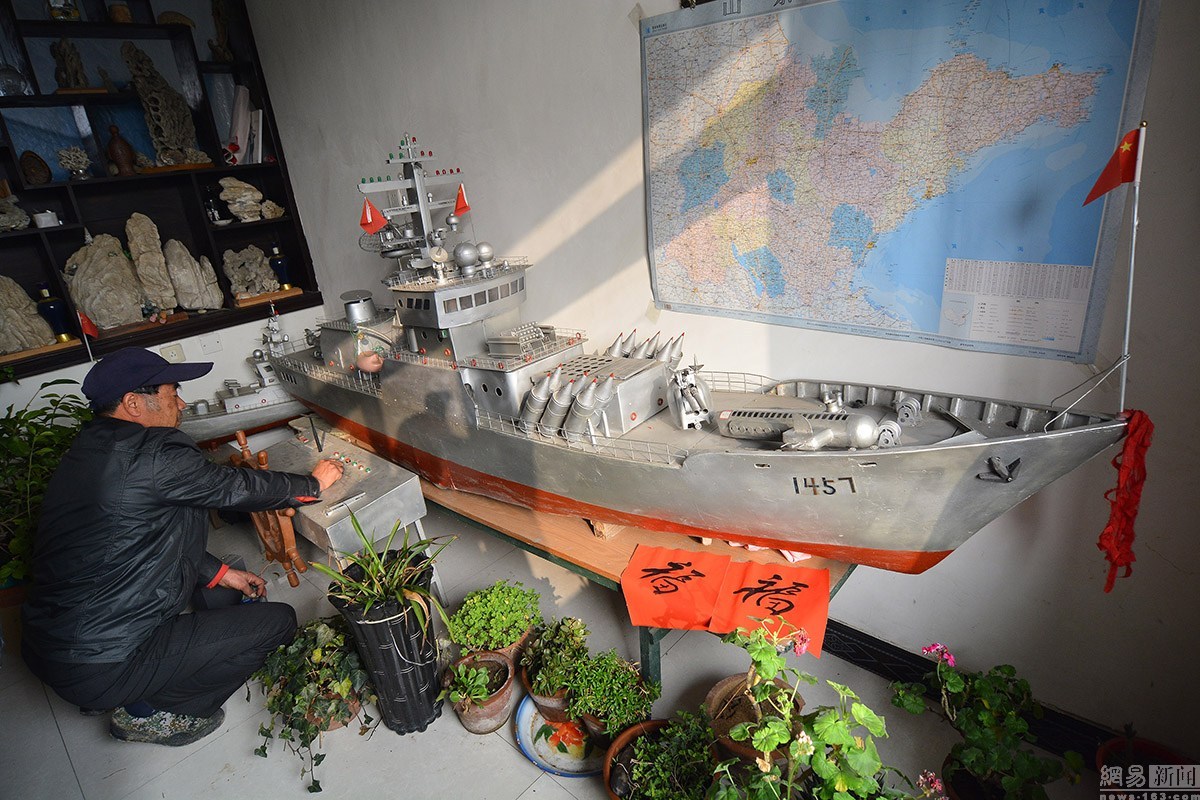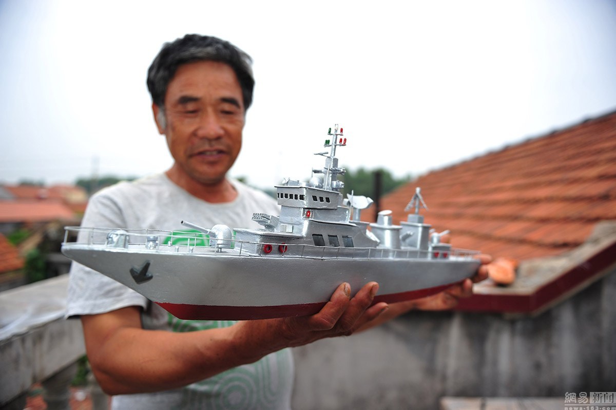 郭長海,初小文化,當過27年的船長。2005年,迫于海洋漁業的枯竭,他將漁船賣掉。但是仍然割舍不了對大海的依戀之情。平時,他喜歡從電視上了解國家大事,最愛看軍事頻道,耳濡目染,于是對軍艦產生了濃厚的興趣。農閑的時候,郭長海便琢磨起了艦艇模型的制作。