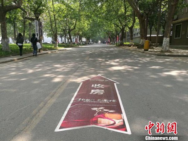 校園內貼有收房指示路標。記者4月27日在西安建筑科技大學華清學院看到,華清學府城與該校緊鄰,中間有一道門可以進出。樓盤交房廣告標語張貼于學校大門的門柱上,寫有“交房臨時停車由此進入”、“46#樓交房現場由此前行”、“熱烈祝賀46#樓盛大交房”等標示。