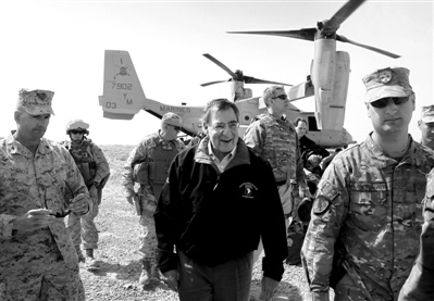 14日,正在阿富汗訪問的美國國防部長帕內塔乘軍機抵達一處軍事基地