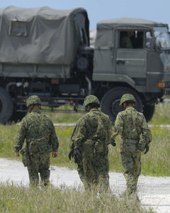 日本防衛省計劃讓陸上自衛隊員荷槍實彈,守衛“愛國者-3”地對空攔截導彈。圖為4月4日,日本自衛隊員在石垣島新港地區展開部署。(共同社)