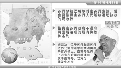 卡塔爾半島電視臺19日援引蘇丹官方通訊社的消息說,蘇丹總統巴希爾當天在北科爾多凡州首府歐拜伊德的群眾集會上發表講話,稱只有用大棒才能懲罰南蘇丹,蘇丹將通過軍事手段解放南蘇丹。