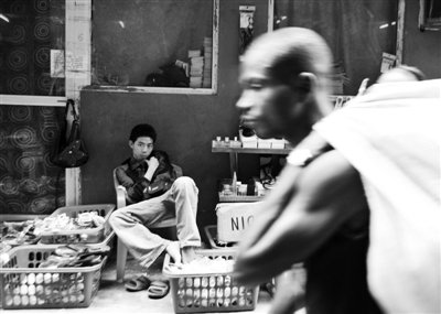 2002年,一名中國男子從尼日利亞拉各斯中國城的布店走出來。
