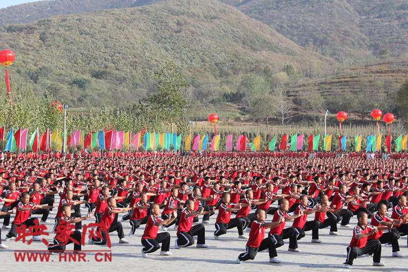 10月22日,少林寺塔溝武術學校的學員在第九屆中國鄭州國際武術節迎賓式上表演萬人團體武術。