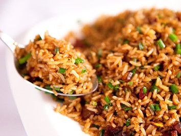 2. 用2大匙油小火炒香蒜末,然后放入臘腸丁、臘肉丁略炒,加入白飯炒勻,并加入其他,最后撒入青蒜,炒勻后盛出。