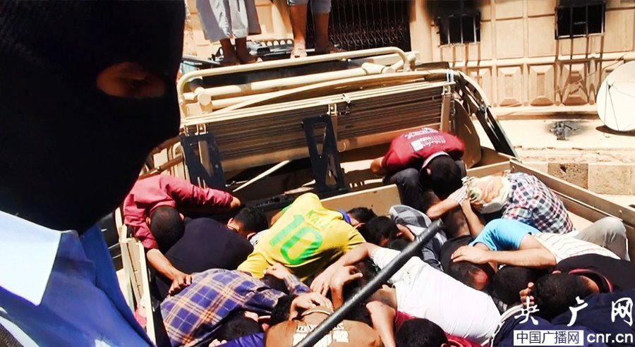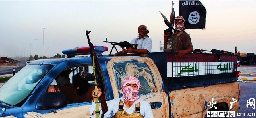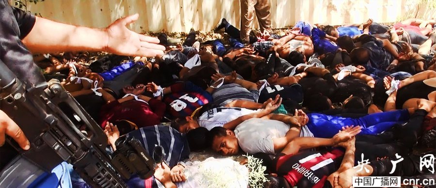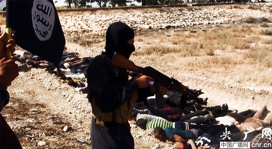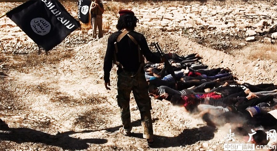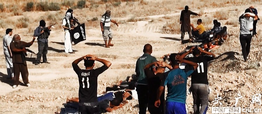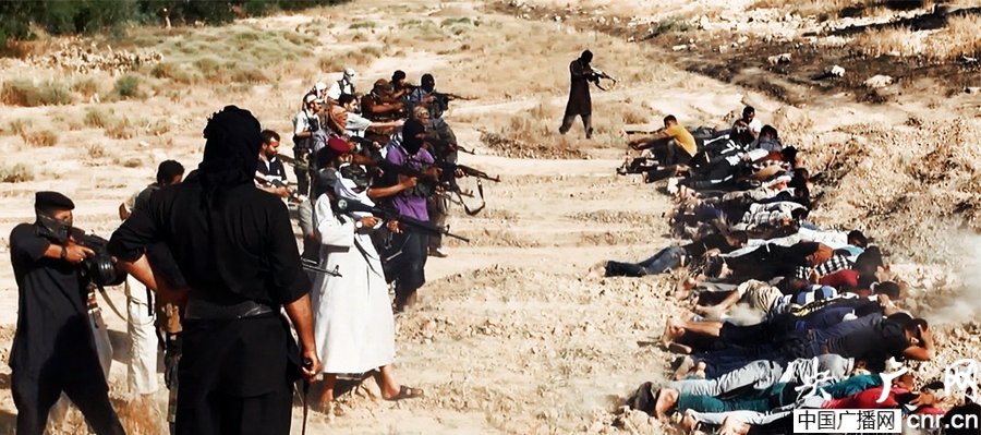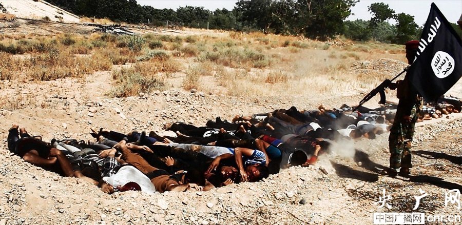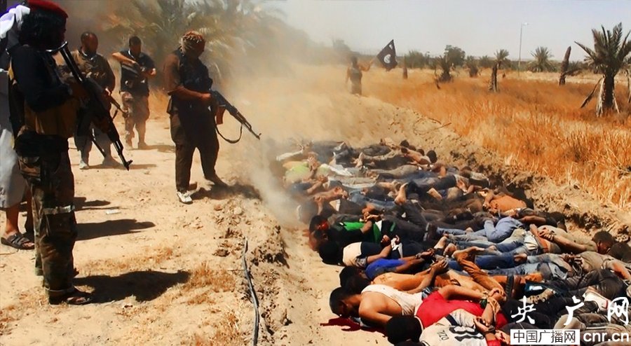 當(dāng)?shù)貢r間2014年6月14日,伊拉克薩拉赫丁,伊拉克極端武裝“伊拉克和黎凡特伊斯蘭國”武裝人員處決大量俘虜?shù)囊晾耸勘?/p>